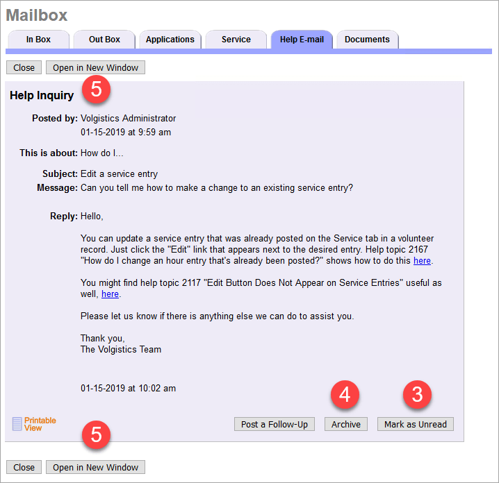 First, when you log into Volgistics, you’ll notice that the menu has changed slightly. Instead of “Help”, you’ll see “Help Topics” where you can search through our documentation. You’ll also see “Support”, which will go right to the Help E-mail tab of the Mailbox. The Support menu item will also include a badge notification when you have unread responses from the support team.