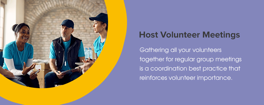 Gathering all your volunteers together for regular group meetings is a coordination best practice that reinforces volunteer importance. These meetings allow you to communicate essential information and strategies, from upcoming event calendars to fundraising goals, staff changes, new policies, and more.