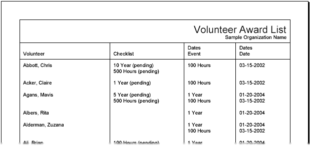 Volunteer list reports have a column and row format. They list volunteers alphabetically or you can choose to have them sorted by volunteer number, years of service, or any of the subtotals for volunteer service information such as lifetime hours. Each row can also include any fields of information you choose from the volunteer record.